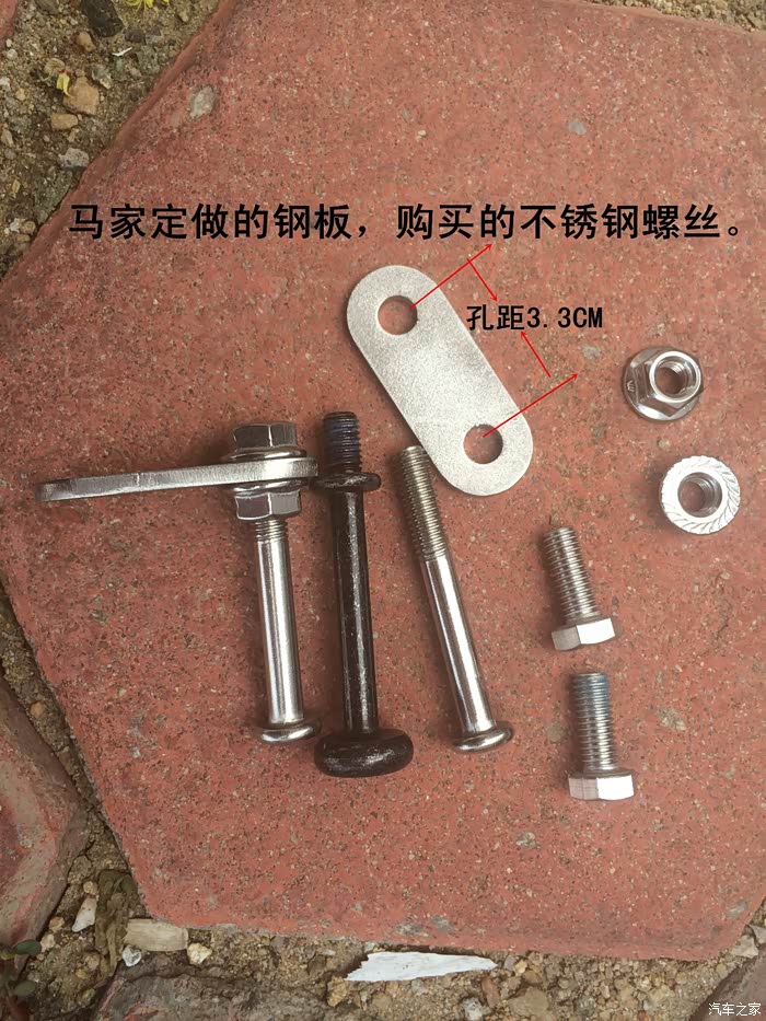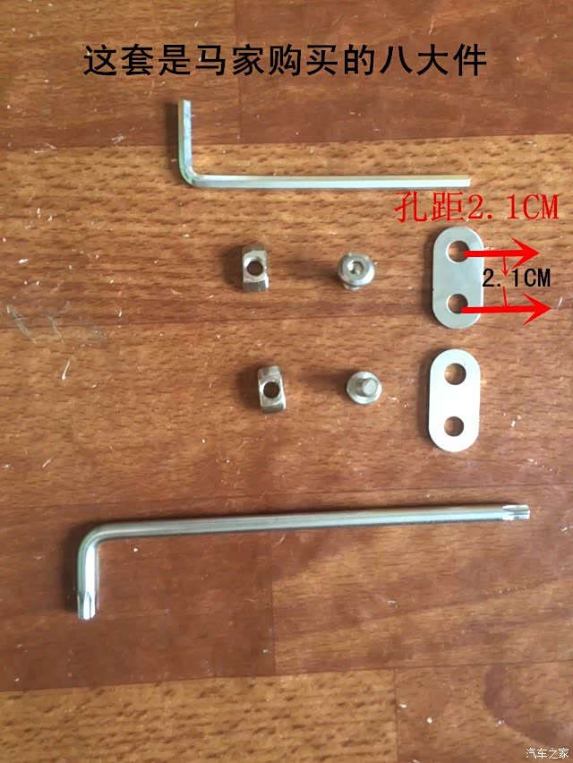 我买的长螺丝还算配套吧,不锈钢的,安装完后放倒座椅的时候一点不碰内饰板了,非常开心。那两个短的6边形螺丝(规格:M8,2cm)是取代八大件里面那两个内六角螺丝的,这个6边形螺丝比内六角螺丝给力多了,内六角螺丝这的太容易滑丝。四个不锈钢螺母是将长螺丝固定在钢板上用的,大家应该一看就懂。