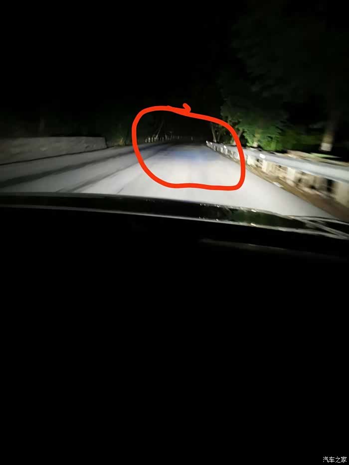 2、LED大灯铺光有暗色光斑,论坛里和群里有几位也遇到了类似情况,去4儿子店找师傅也解决不了,说是要反应给厂家,售后还有说这是恶魔眼的,我也是醉了。按照论坛大神的方法进行调节也无法调出很好的效果,这点希望厂家重视。因为本人有时候会开山间二级路的夜路,这两坨东西在地面不平时一上一下得晃动还是对眼睛有影响的,如下图。