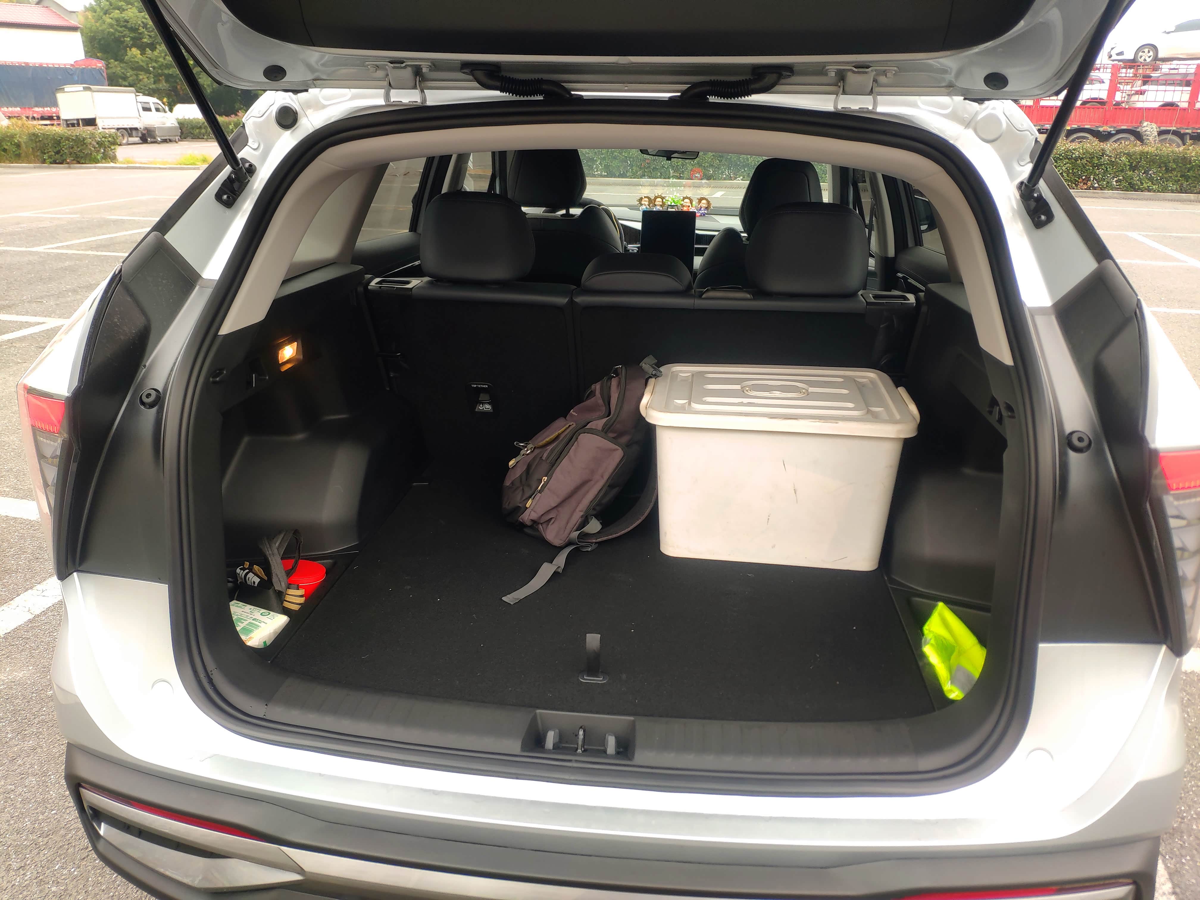 图中白色的箱子后备箱里也可以装个七八个的,放长的物品后排座椅还可以放倒,储物空间给的也是到位的