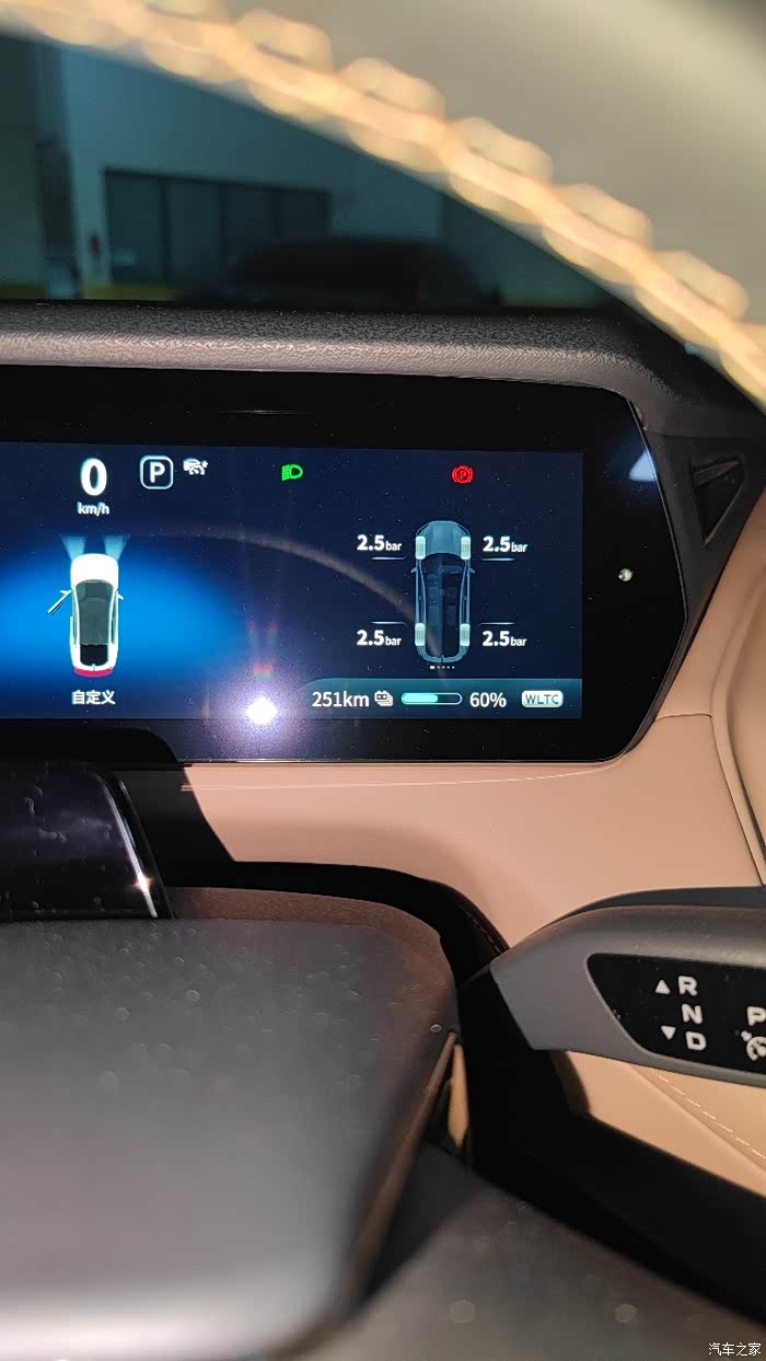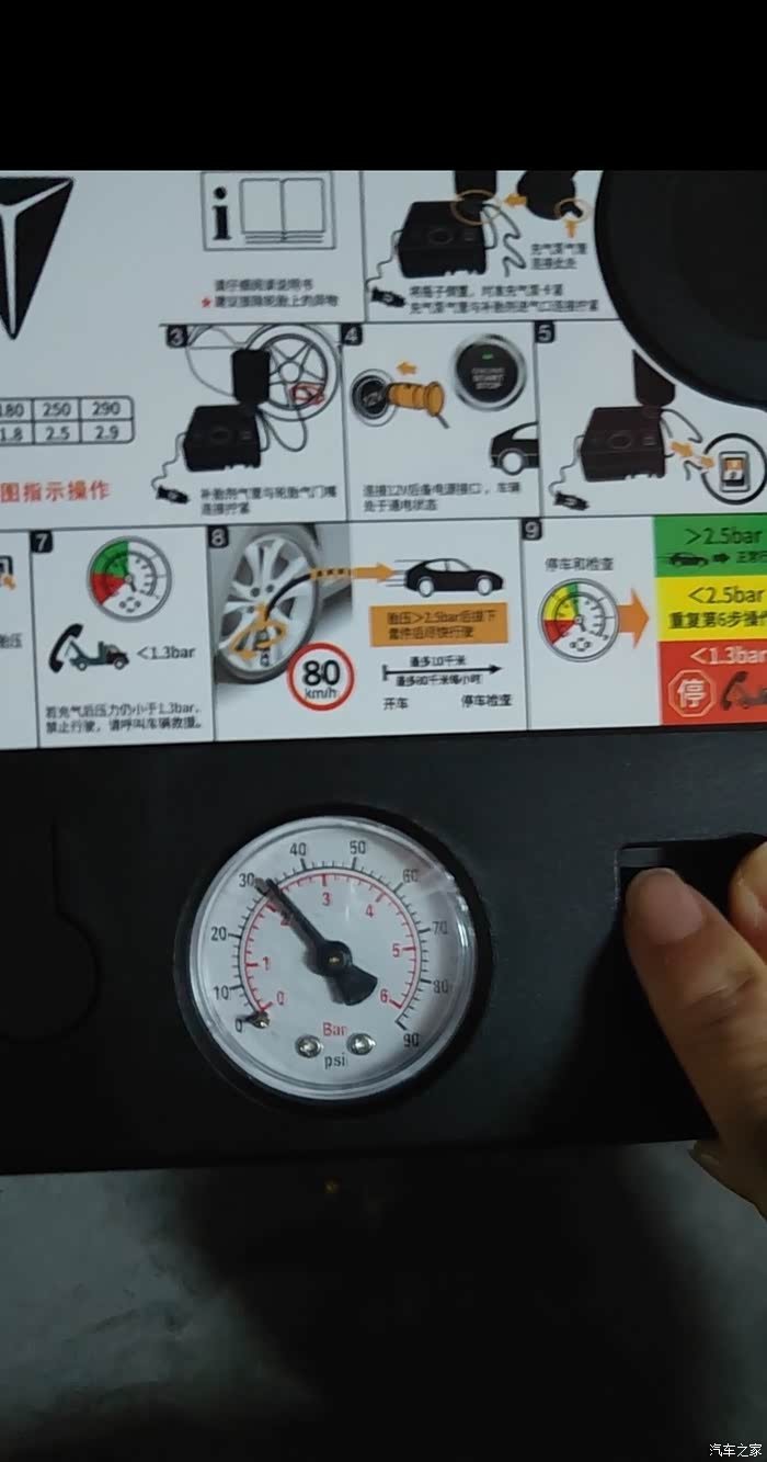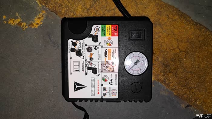 打开前些天在ca深蓝车友会的公众号上看到的详细的教程,把整个流程学习了一遍,从尾箱垫子下面拿出黑色的充气套件包包,拿出方形的充电泵,扯出电源线和充气管。原本还担心线会不会不够长,一扯出来才发现原来那么长!绝对够够的!首先把电源接头插到中控扶手下方的点烟口,然后拧下轮胎充气口的螺帽,插入充气管后顺时针方向拧紧螺丝,充气泵立马会显示目前的胎压数据,接下来就可以开始充气啦,按下充气泵的开关,突突突的就开始工作了。说实话,那动静还挺大的,充气泵振动得挺厉害,很快指针就从2上升到2.4了,但是2.4到2.5费的时间就长很多,而且虽然看到指针到2.5了,一关闭开关又会往回跳一点,于是反复了两次总算指针到2.5了,可车上的胎压监测显示数据还是2.4,于是又充了一会,指针跳到2.6的时候,胎压监测显示2.5了。到后面几个轮的时候就已经有经验了,基本上一次过顶多两次就能到2.5。