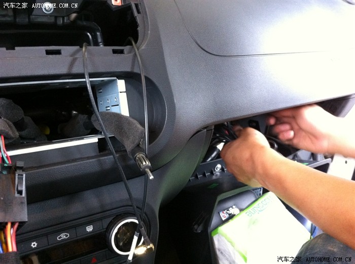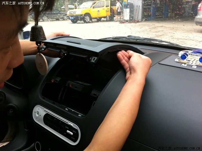 1、 先把中控台的空调出风口取下。装潢店的有专用工具,不会损坏内饰。