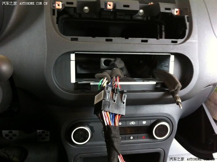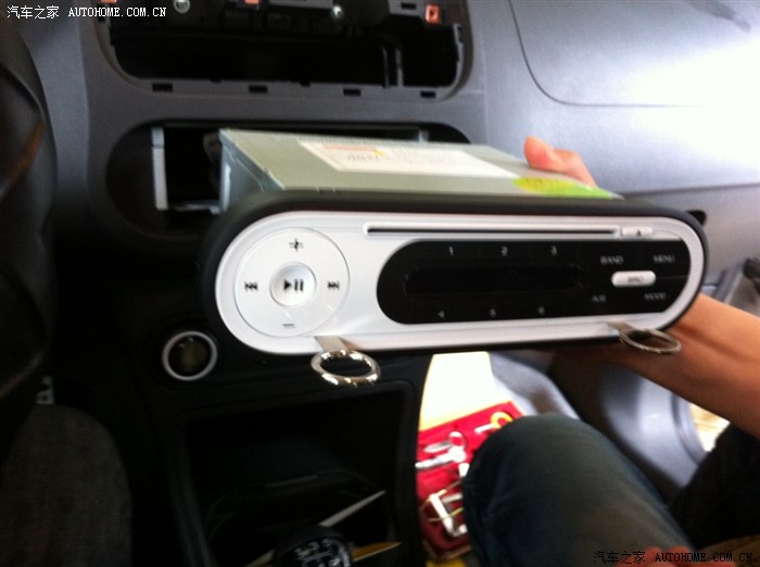 4、 CD也要取下来,这个装潢店的也有专用的工具。就是图片中CD机下面两边的两个带圈的工具,从CD机预留的两个小方孔插进去后就可以把整个CD取出来了,呵呵!不看不知道呀!