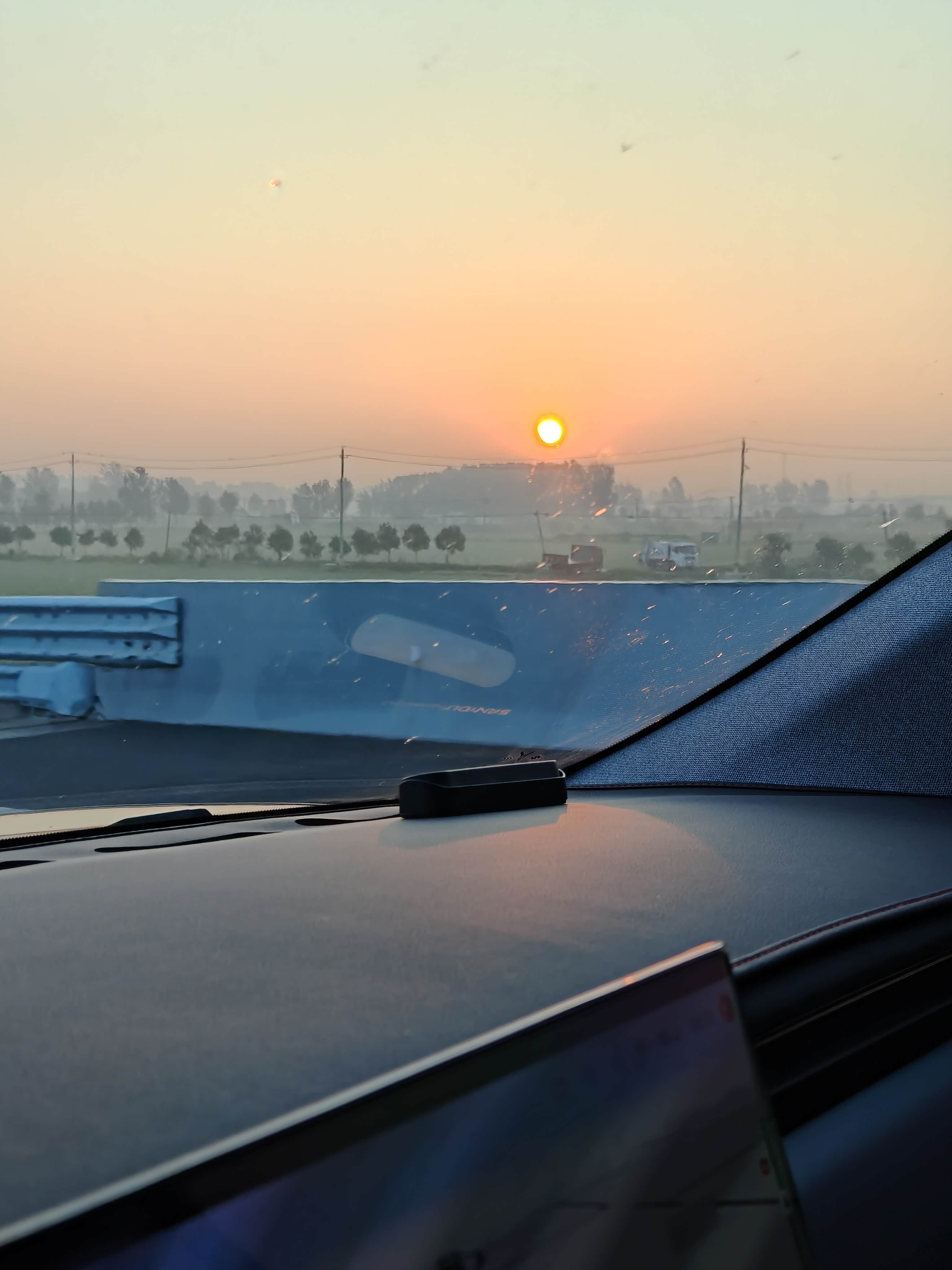 一路上,因为是夜间行车,到了午夜,孩子和老婆在后排已经安静的睡着了,而我独自一人驾驶着知音在高速公路上疾驰。一路上充电4次,每次充电就是我休整的时间,这和开油车的感觉截然不同,油车因为续航长,加油快,所以很容易疲劳驾驶,可电车就完全不会,开个300多公里就需要充下电,人也可以借此机会休息,这种感觉还是挺好的。清晨的时候已经进入到了山东境内,看到美丽的日出,忍不住拍一张。