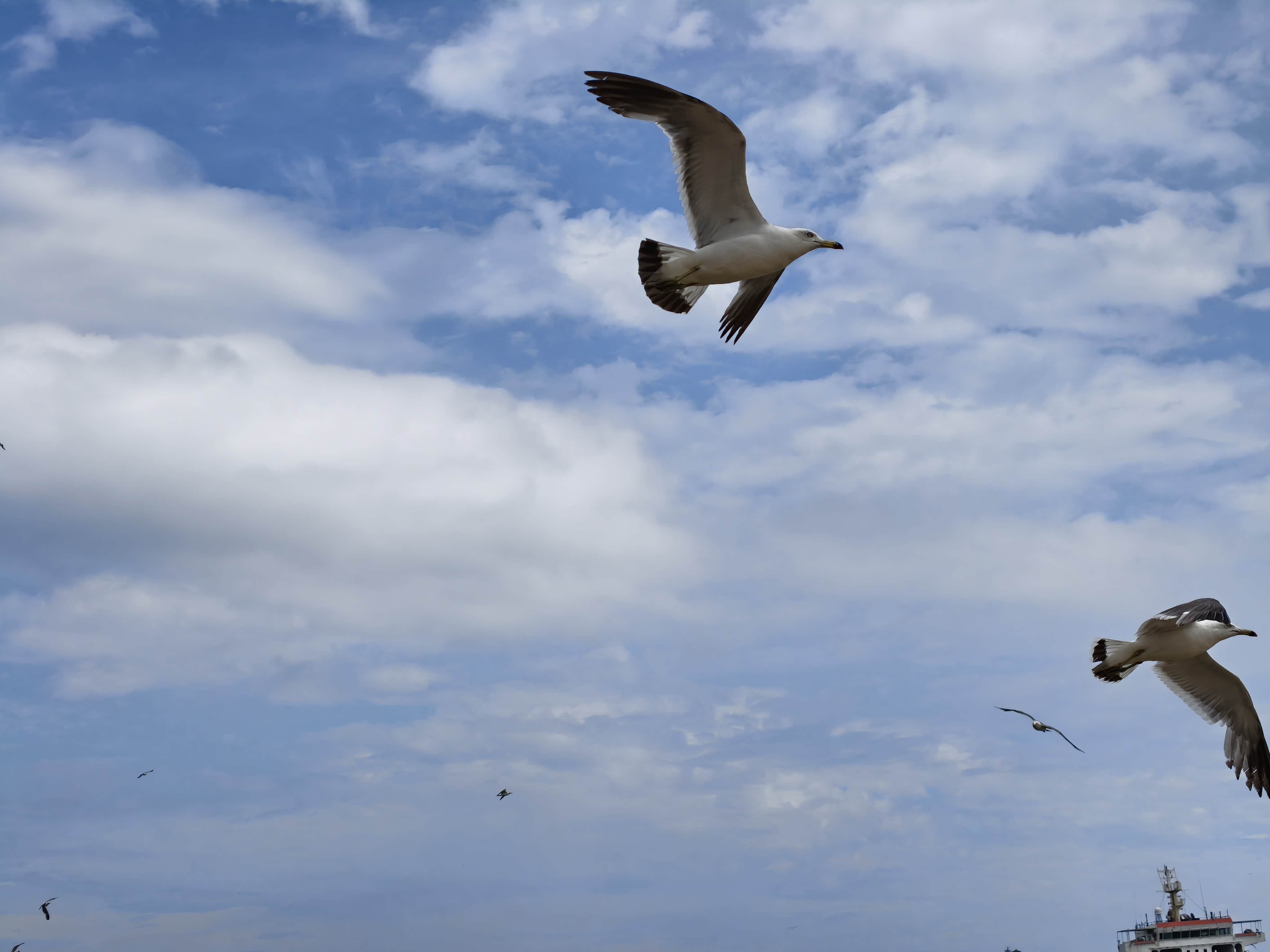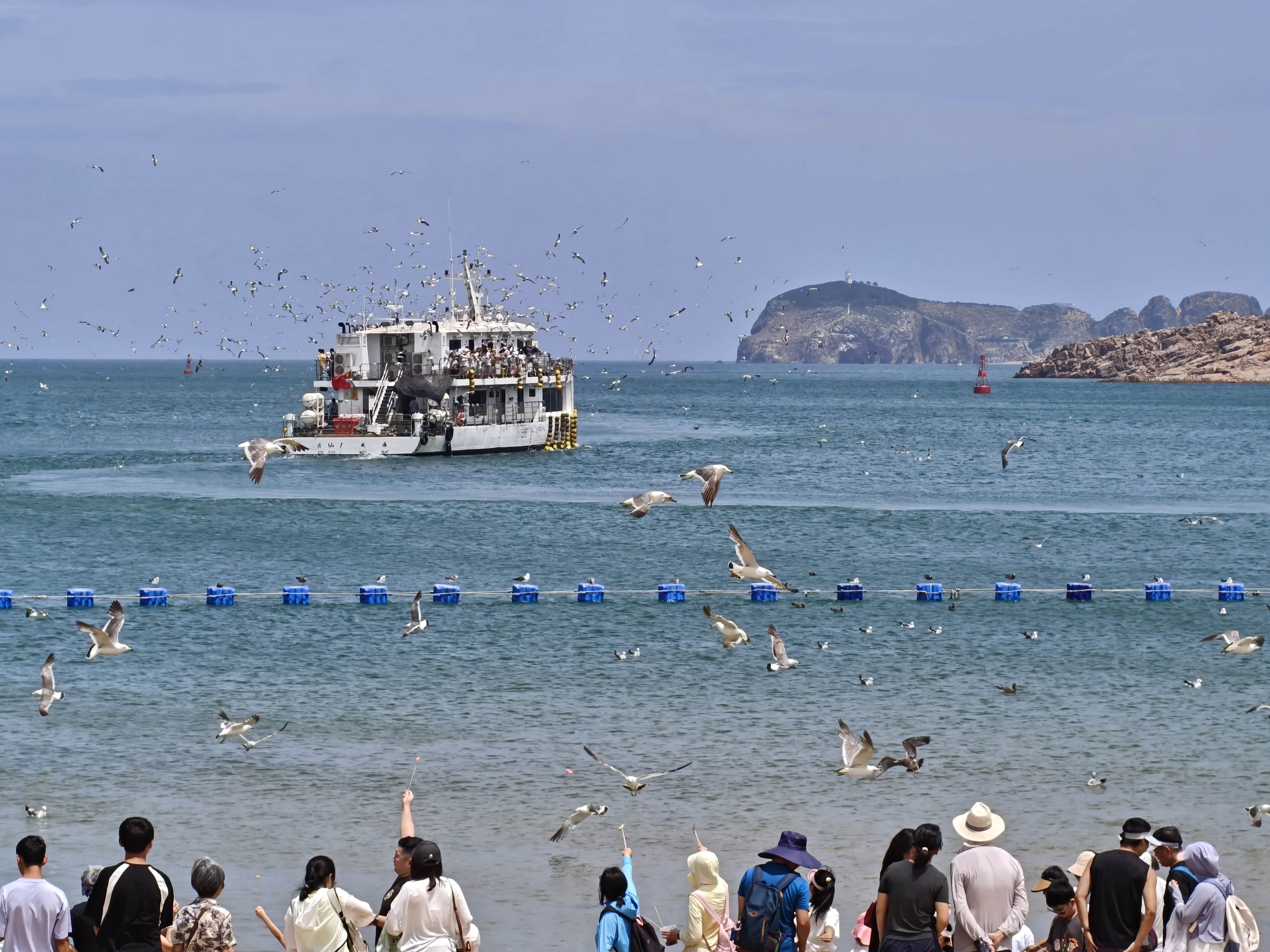 当然,来到荣成,不能错过的还有海驴岛的码头喂海鸥。由于太多人排队乘船了,我们就选择码头岸边喂海鸥,没想到效果还是挺不错的。它们或盘旋在空中,或栖息在礁石上,或在水面上游弋,姿态各异,美不胜收。我们买了火腿肠,站在岸边,把火腿肠用筷子串上,手举向空中,海鸥们便会纷纷飞来争抢。那一刻,我仿佛融入了这片大海和天空,与海鸥们共享着这份自由和快乐。