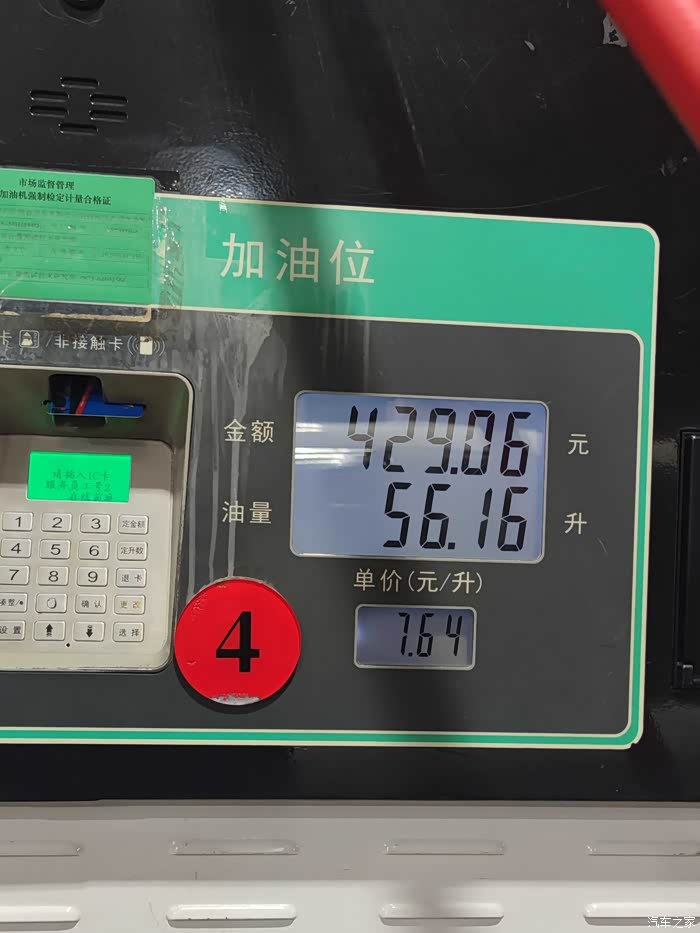 表显0格油,加油到跳枪!油费429元,加油量56升!(从这里看,油箱容量总的应该不止58升,加上设计上的预留空间,网友反馈60升的官方容量,应该有一定参考性)