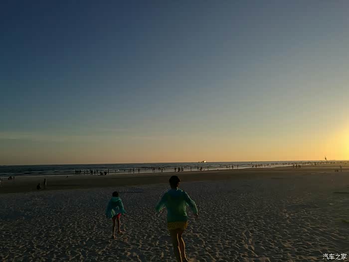 怕晒,时间没掌握好,到海边太阳快落山了。但夕阳很漂亮。银滩滴沙滩真的很好,沙子很细,也还算干净。终于到海边了,两美女已经迫不及待了。