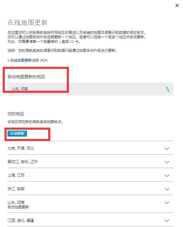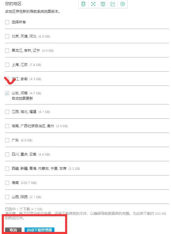 有自动更新和手动更新,如果车机自动更新了会提示哪几个省市更新,如上图自动地图更新的地区山东河南。应该是默认的更新注册人户籍所在地的地图。下边可以选择手动更新,然后选取您所要更新的地区,这地图包太大了,可能内涵多哈哈。