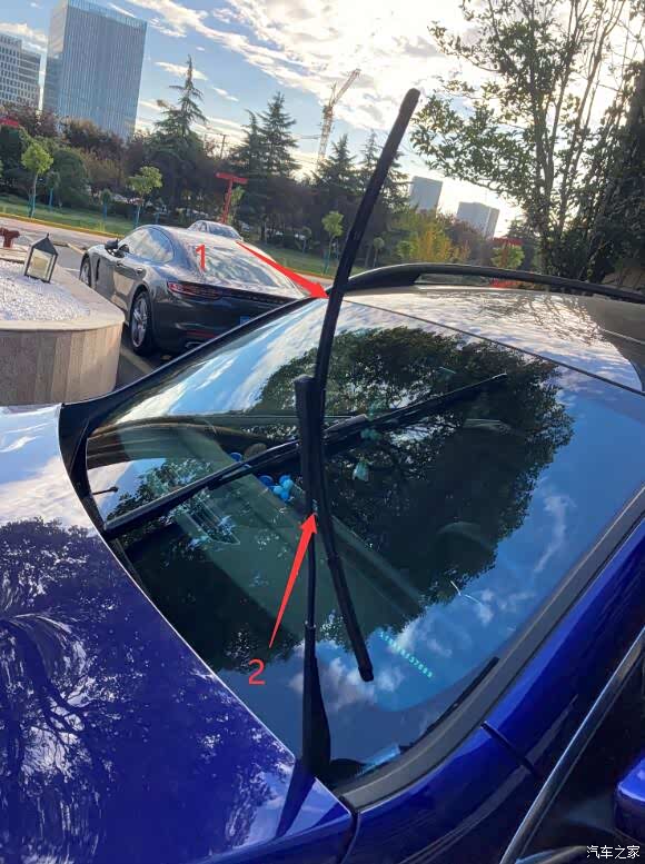 把雨刮臂抬起来自然状态下,1处位置是有角度的,2处位置是紧贴雨刮臂的