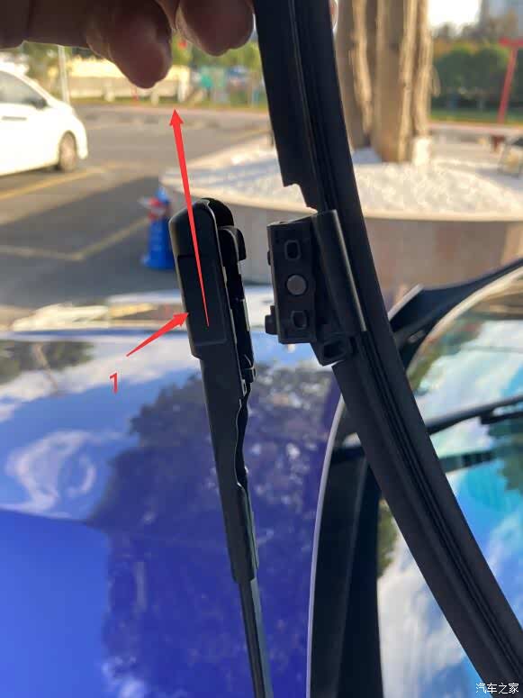 此处是关键,把1的小扣盖向箭头方向滑动,用力些,滑动开后直接雨刮刷与雨刮臂分离,更换新的雨刮刷,此时注意更滑是要用毛巾包住雨刮臂,玻璃垫个毛巾,不然雨刮臂弹回玻璃把玻璃打碎就不划算了。原路装回去,上车再刮下就恢复了,希望能帮助车友