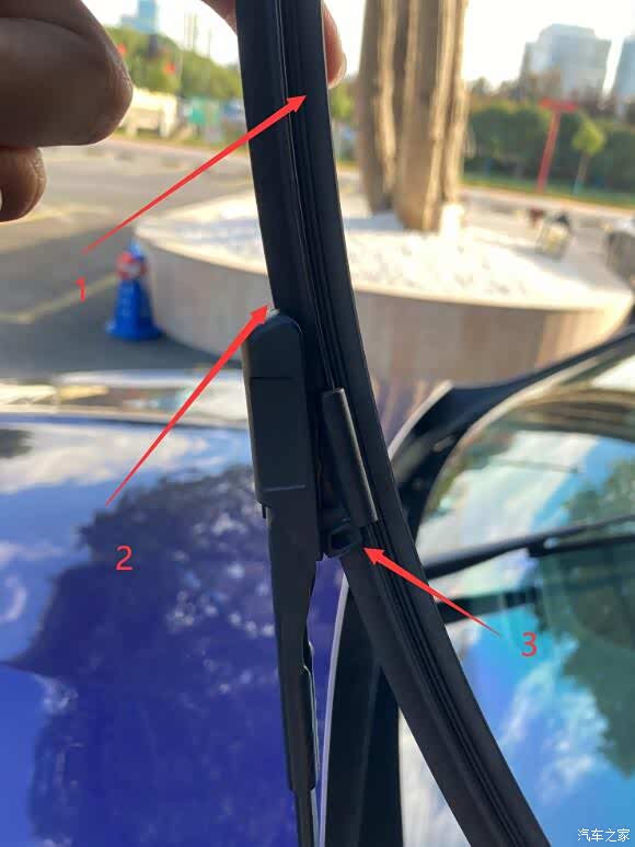用手掰下雨刷让1处,2处紧贴雨刮臂,3处与雨刮臂有一定角度,漏出3位置的小方形凹槽。