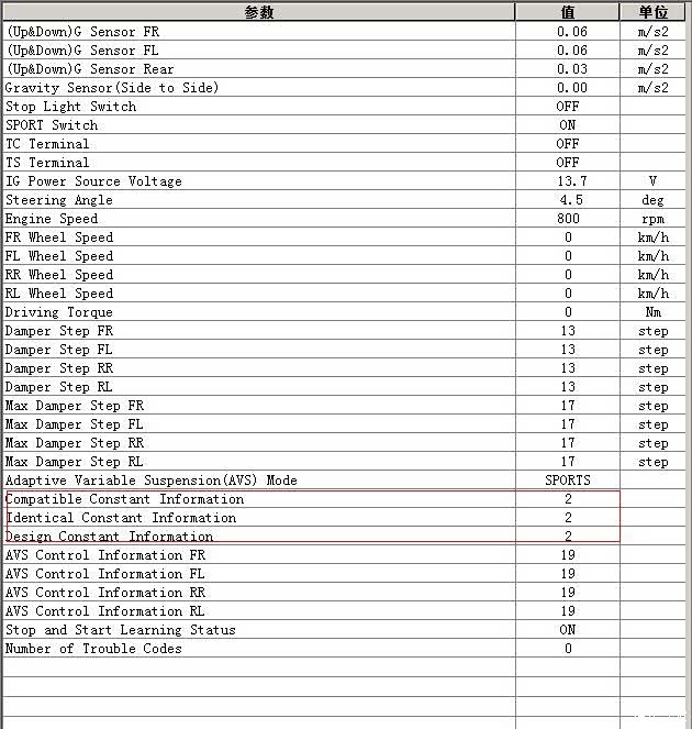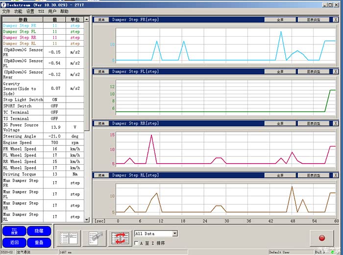 不时瞄了下电脑屏幕,,,4个悬挂确实都是独立的在调节,和我之前推测的后轮是同时调节有一点出入。不过后轮左右两边调节幅度很接近
