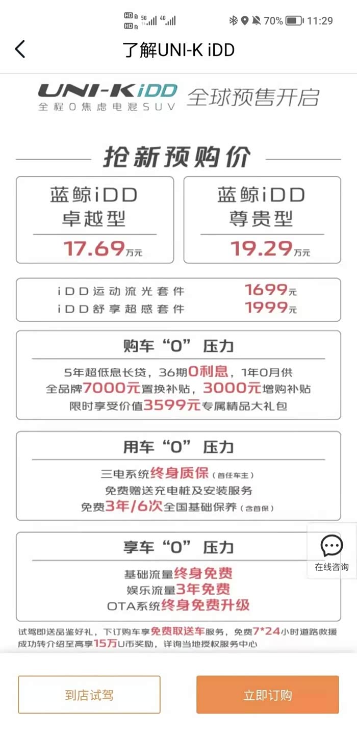 UNI-K iDD现在的预售政策也挺吸引人,我看中的17.69万卓越型,可以享受到3599元精品大礼包,3年/6次基础保养,尽管我是首次买车,无法享受7000元置换补贴,有点小遗憾。不过我觉得这已经很让我满意了,现在车辆已经预定了,希望这款车在虎年能够早日让我提车,早点感受一下UNI-K iDD的魅力。