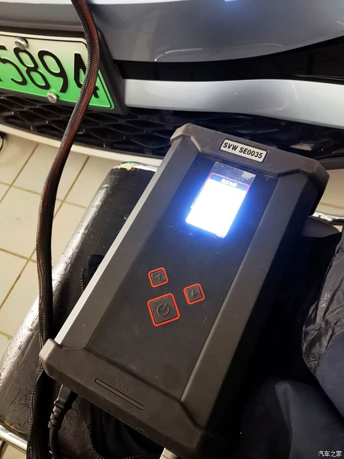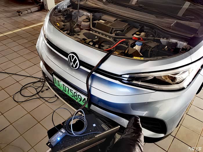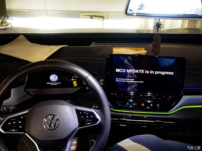 完成外部辅助设备的链接后,维修师傅在前排的C口插上了U盘,同时把专用电脑与ID.杜连接好,经过一顿操作,仪表盘和中控车机屏幕上就出现了ABC的英文字母😅——升级正式开始!