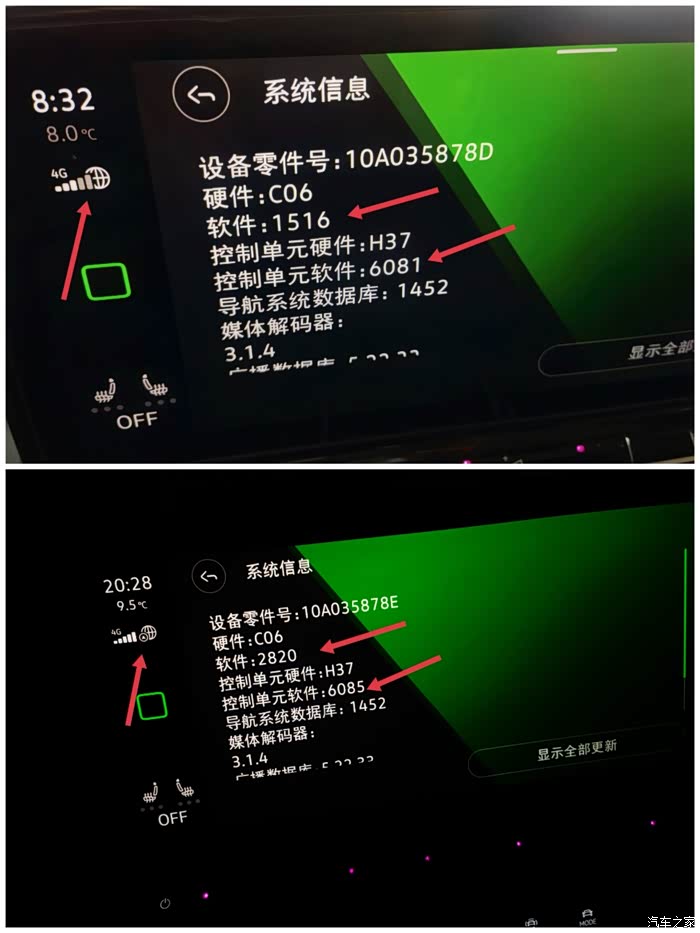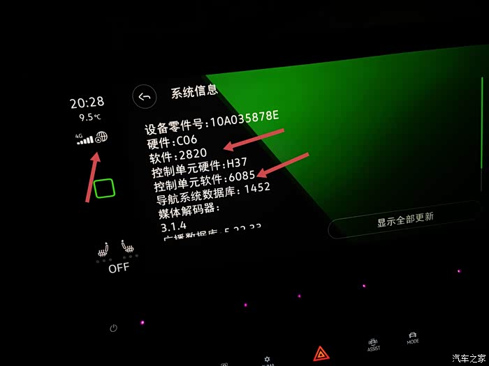 2.车机左上角的小地球旁边多了一个小箭头标志,系统信息里的“软件”变成2820,“控制单元软件”也由原来的“6081”变成了“6085”;