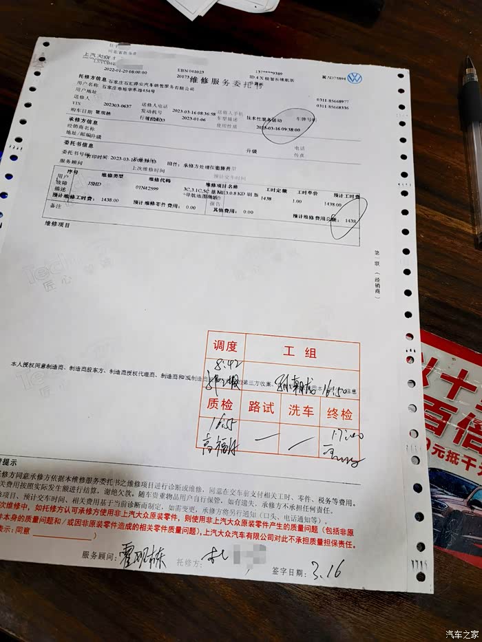 一直到下午17点,服务顾问才通知我来取车。委托书单上显示,这次升级的工时费高达1438元😲