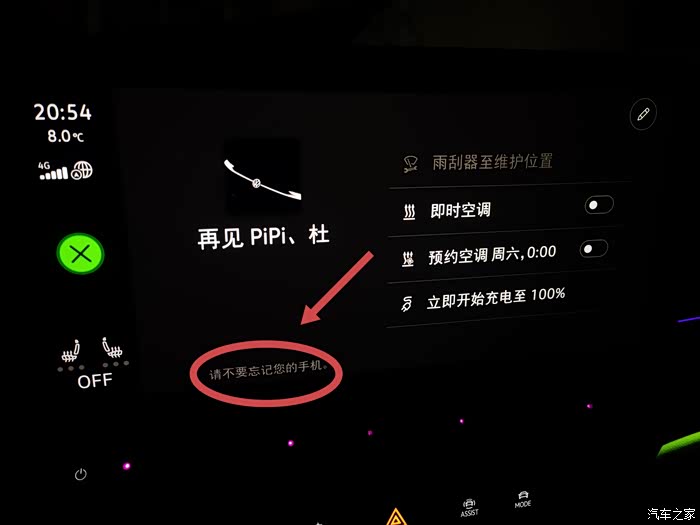 如果下车前车机与手机有蓝牙连接,在下车前,车机屏幕的下面会有一行字提醒驾驶员;