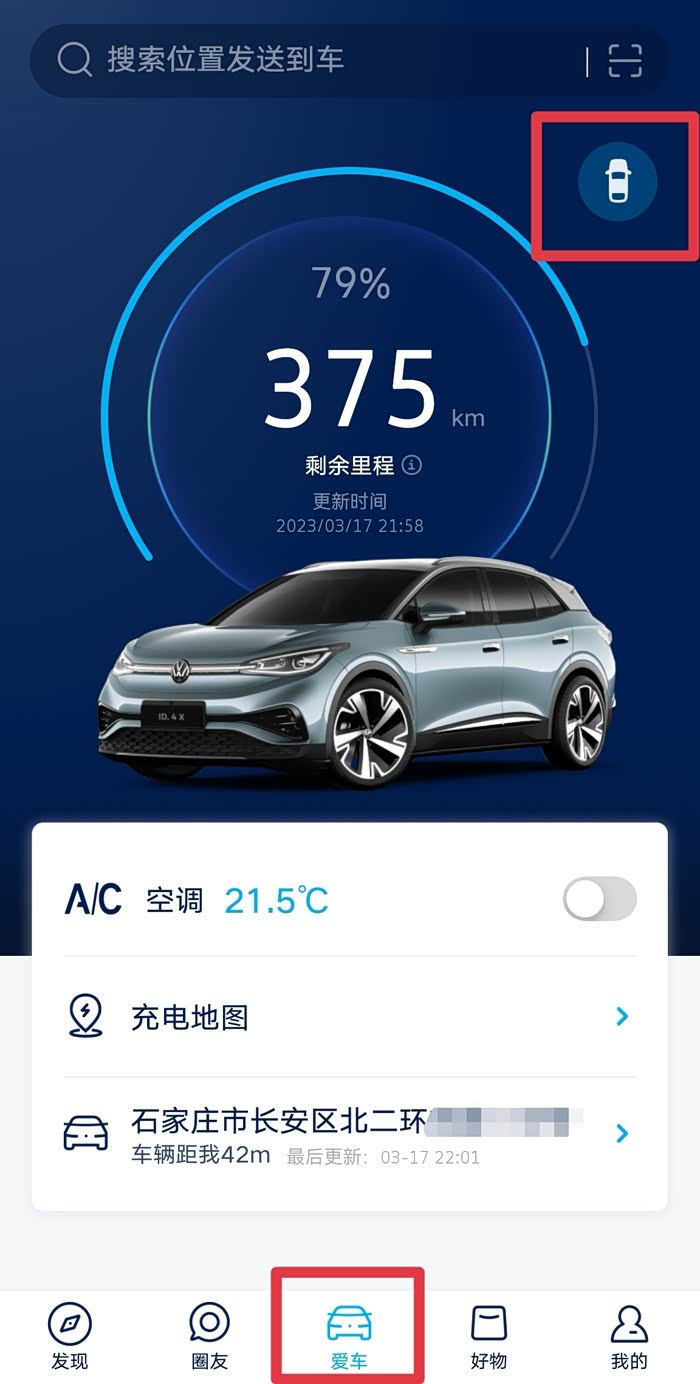 14.升级后的第二天下午,上汽大众APP的“爱车”界面右上角,多了个小汽车标记,可以远程看到车辆是否锁闭;