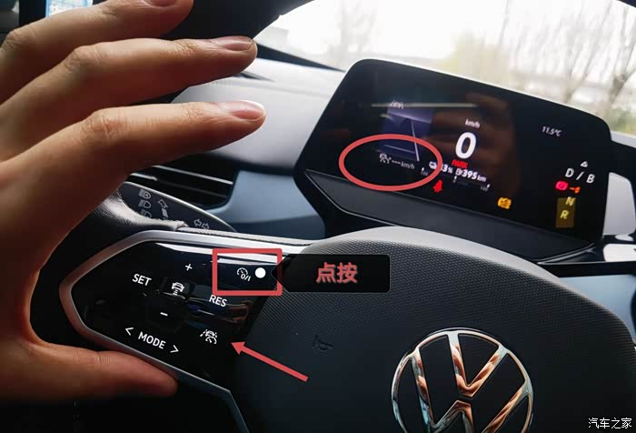 8.点按多功能方向盘左侧部分的右上角开关,当仪表盘左侧部分能看到车速待设定标志时,方向盘左侧部分的右下角亮起,可直接点按开启半自动辅助驾驶;