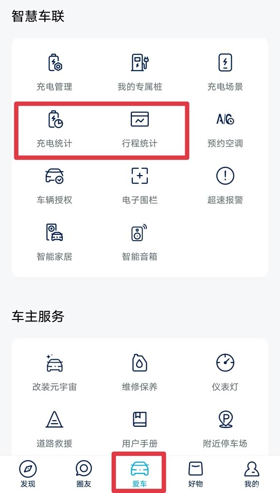 并且在“爱车”的“智慧车联”菜单下,增加了“充电统计”和“行程统计”。