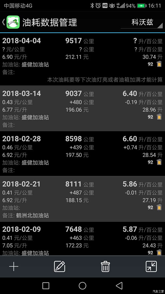 倒数第二张展开了细节供大家看看统计原理,手机屏幕只能截图这么大了,原理都一样。每次加油到邮箱自己跳枪,这样每次的加油量就是两次之间公里数的用油量了。最后一张不展开细节的就能看到所有的记录了, 实际油耗比车显和OBD盒子统计的会更少一些。