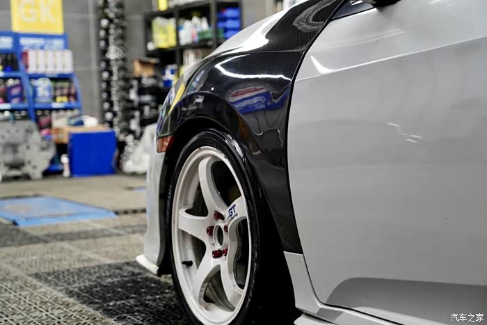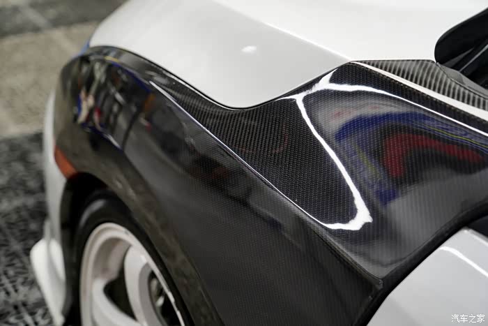 碳纤维叶子板不是为了轻,因为实际我们测得重量没有相差多少。车主的意思就是为了搭配才选择,白莲花的车上终于有点黑色的点缀。