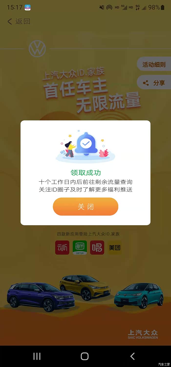 迅速到账,不知道国产新势力或者特斯拉会不会这样送免费流量,但是大众送了,至少算是一种对待车主(用户)态度上的转变吧。要知道,大众之前可是高级的神车,爱买不买哈哈