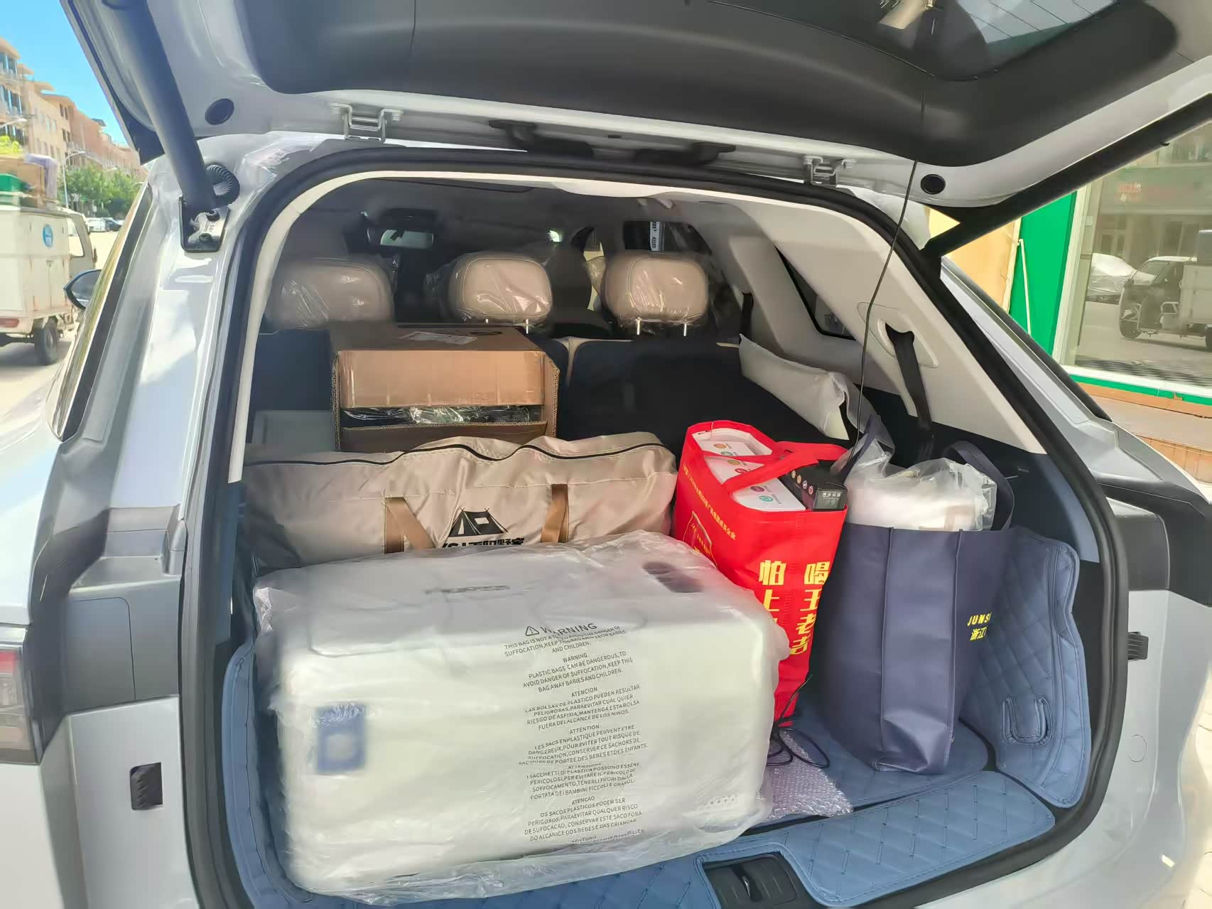 出发前收拾行李,风云T9的空间先给了我们第一个惊喜。的后备箱直接吞下一整套折叠茶桌、卡式炉、两大箱刚捞的梭子蟹和皮皮虾、6把折叠椅,连朋友的手鼓和迷你音响都能轻松塞下。后排座椅支持比例放倒,我特意留了一半空间,让爱拍照的朋友能随时躺下,透过1.18㎡的全景天窗拍天空——后来追夕阳时,这处设计成了最佳“观景位”,而静影灰的车身停在路边,和远处的青山浅海莫名搭调。