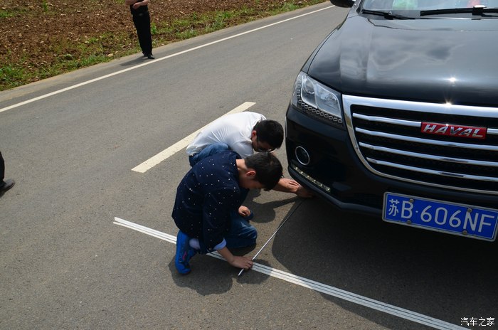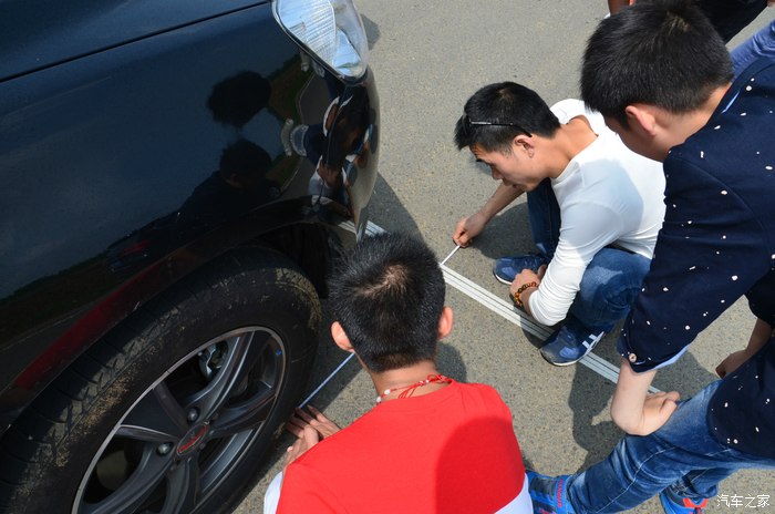 下午精彩的车友互动游戏环节开始,找了个空旷无车的马路。连续绕10个桩,之后定点停车,前轮最接近白线为获胜。