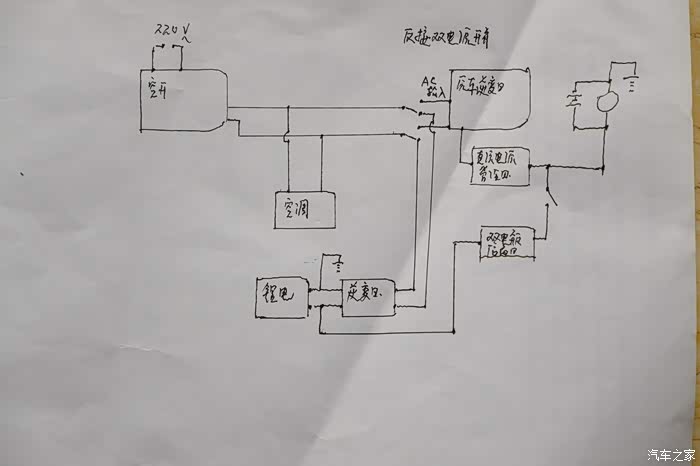 二、电路的基本思路,根据对RV80原车的电路分析,有两种基本改装方案。第一是后面装载箱空开部位改装,在空开后加装一个双电源转换开关,可以加自动的,也可加手动的。加自动的是方便,当在营地插接外接220V市电时则自动转换到外接市电模式,当没有市电接入时则自动转换为后加的锂电系统。同时,在原车逆变器的市电(AC)接入口加装一只开关。当用车内锂电供电给空调时需要把这个开关关掉,这个开关的作用就是当用锂电供空调工作时不给原车的生活用电电瓶和主电瓶充电。据测定,大通原车的空调工作耗电在 750瓦到900瓦之间,电瓶的工作电流不高于70A,而通过市电给生活电瓶和主电瓶充电的电流在 40A左右。所以这里必须安装一个开关。 第二的方案是把原车逆变器的AC输入端与逆变器断开,在原车的AC电线安装在一个16A的插座,然后再从逆变器的AC输入端引出两根线并接上插头。同时在新加锂电逆变器的电源线(AC)引到这里并接上一个 16A的插头。这样如果使用锂电的时候就把逆变器的引来的插头插上,若需要使用市电时则把逆变器AC输入端引出的插头插上。这两种方案各具特点,第一种自然要专业些,用起来也省事,但走线麻烦,而且有一节线还得走明线。第二种改装简单,全部可走暗线,但用起来稍微麻烦,需人工转换,但也省去逆变器AC输入端的开关。我自己是选用得第二种方案。