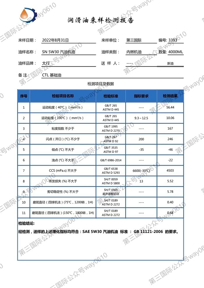 我检测的太行精卫填海5W-30机油,生产日期2022年8月16