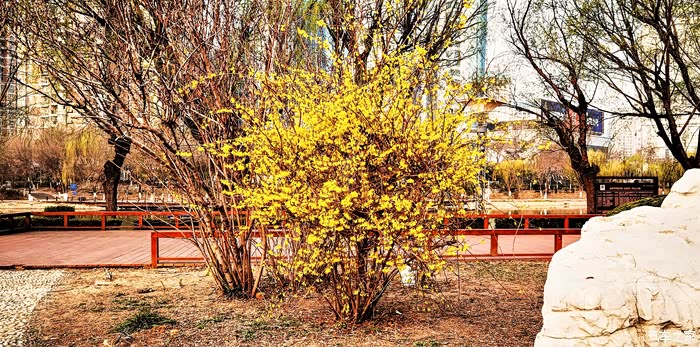 冬去春来,大地和河流沉睡了一个漫长的为冬季,终于揉揉惺忪的双眼,醒了。虞河的冰融化了,碧波荡漾。微风轻轻吹来,像小姑娘的手,梻过一位沧桑老人的额头,原本裸露的枯干、枯枝,绿了。 迎春花星星点点,她是第一个闪亮登场的选手,杨柳又一次扭动那婀娜的身姿,跳起了令人陶醉的舞蹈。又是一年春好处,在这春花烂漫,春意盎然的季节里,放下所有的包袱,将人真正融入自然,漫步虞河岸畔,让灵魂在这春天里与自然尽情拥抱。
