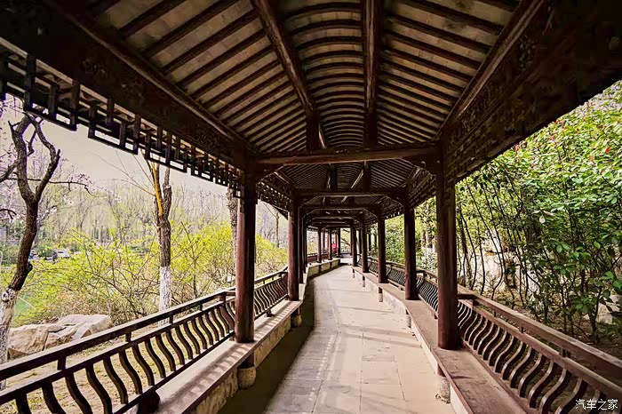 望向河的另一边,淡淡的浅绿,浓浓的深绿,遮掩着一条木质的长廊和亭子