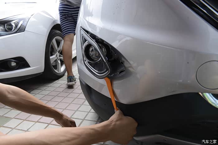第二步,用力把雾灯框先翘出来。当然这是自己的车不心疼,如果担心会翘到车漆的车友们,可以在周边贴点美纹纸。不过这个力度一般是伤不到漆的。