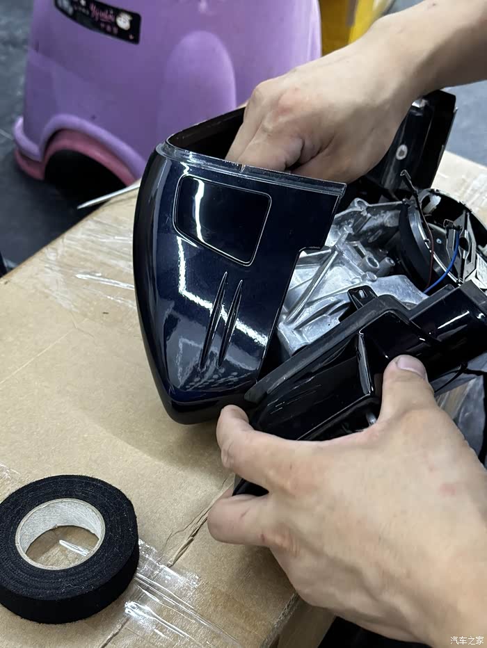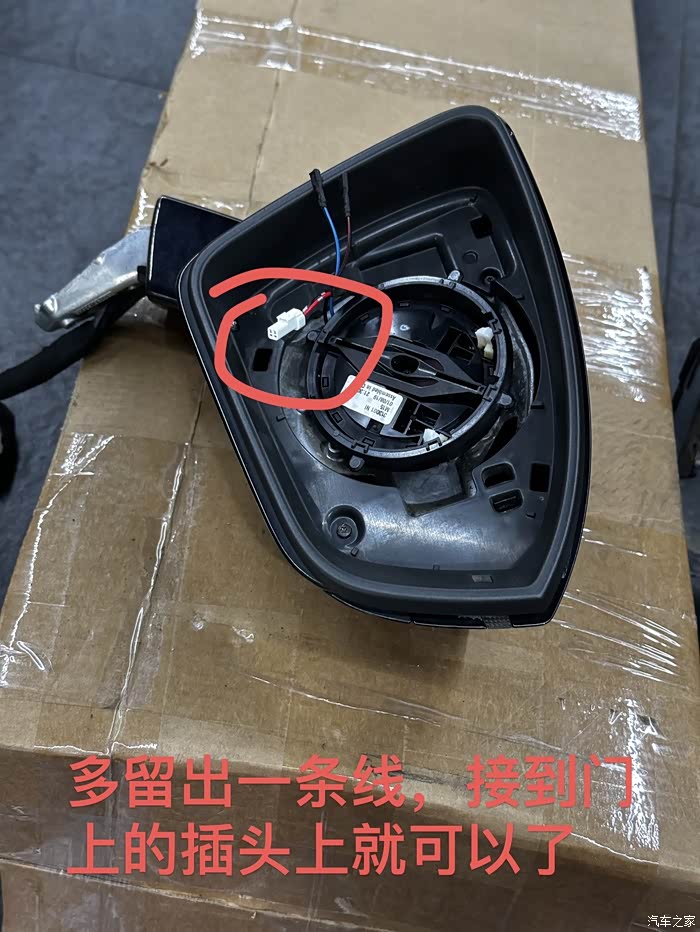 开始换镜片和穿线,穿线就是传一条后视镜片到车门控制单元的C接口的2条线,不分正负极,原厂也有预留位,和左边的其实一样的。