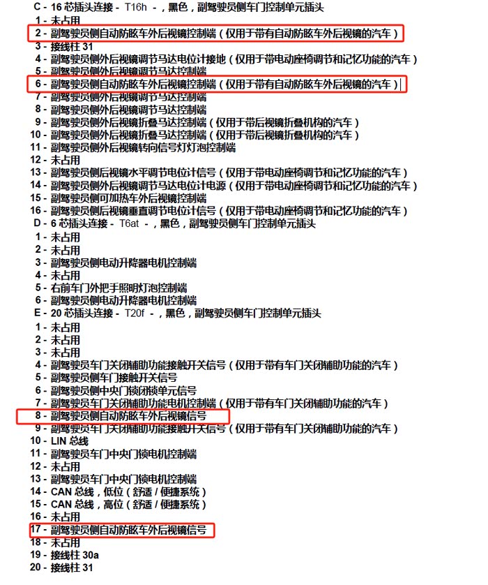 可以看到,红框内部,这几个圈的就是右侧车门控制单元中对后视镜防眩目功能的支持和预留