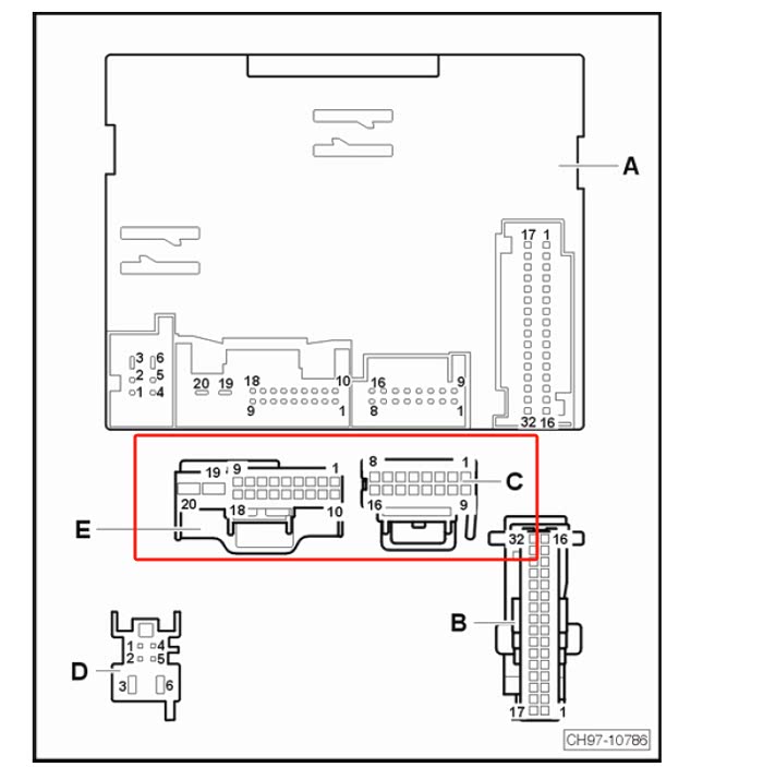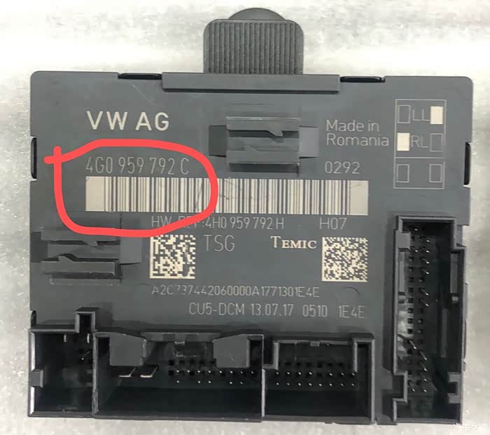 右侧车门的控制单元,792C为准,看一下自己的车是否留有8和17两个位置的针脚,一般留有针脚,出厂时候,从车内到车门控制单元的通讯线也给你留好了,不需要自己再动了穿线。