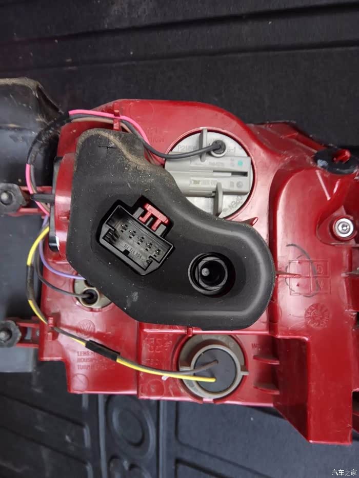 打开尾箱有一块活动的小内衬,可以拿下来,可以看见一个插头和一个白色的螺丝。先拔下黑色的插头,先拔出红色的就可以顺利拔出插头了,然后拧白色的螺丝,尾灯总成就可以拿下来了。