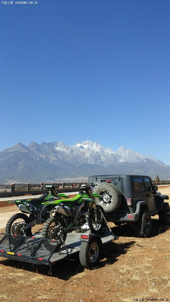 关键是,牧马人后面还拖了斗,斗上还有两辆摩托车