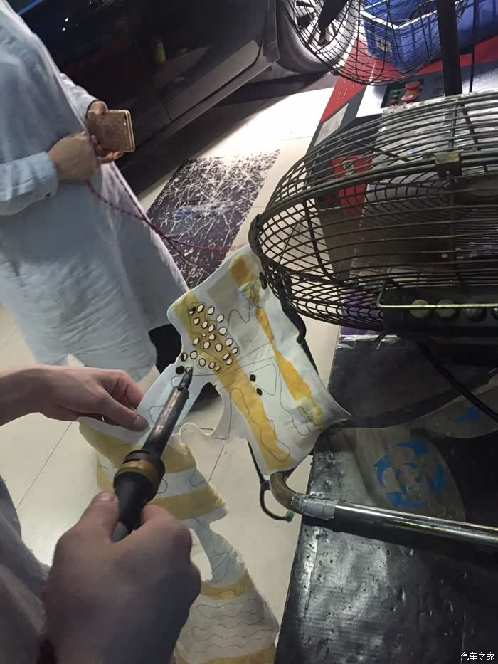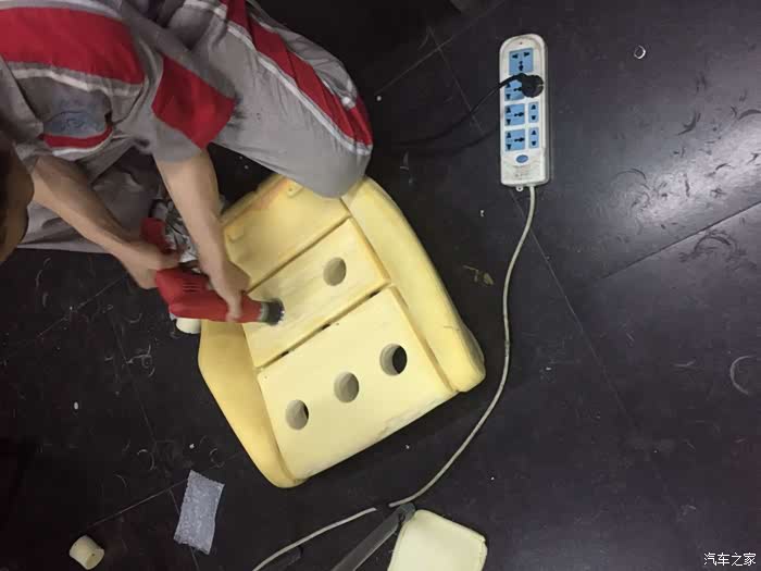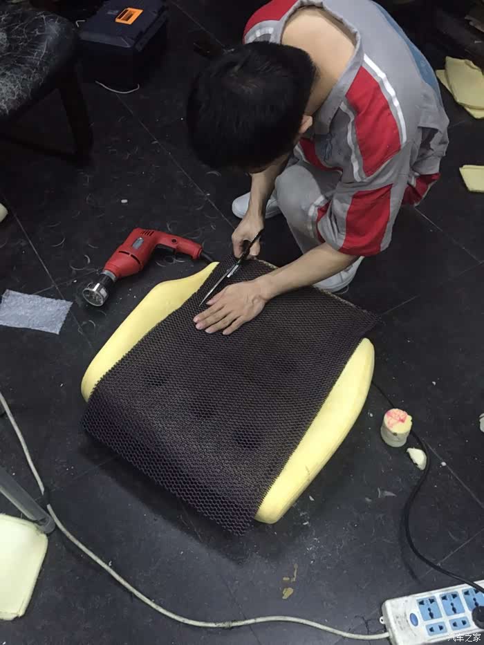 还有个师傅同时居然在做这种事,就是把原车坐垫的加热层打洞。 因为加热垫是要覆盖在风扇上的,所以必须要打孔透风。 这样加热和通风两不误