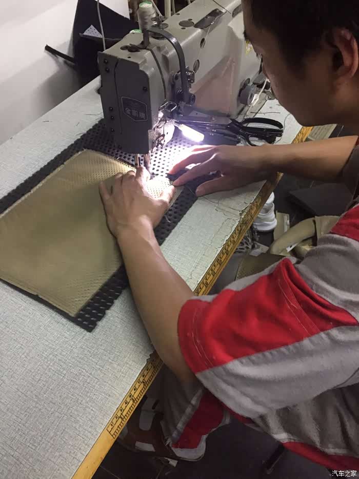 拆下来的真皮,真皮打孔后跟导风棉要缝制在一起,师傅很专业的样子