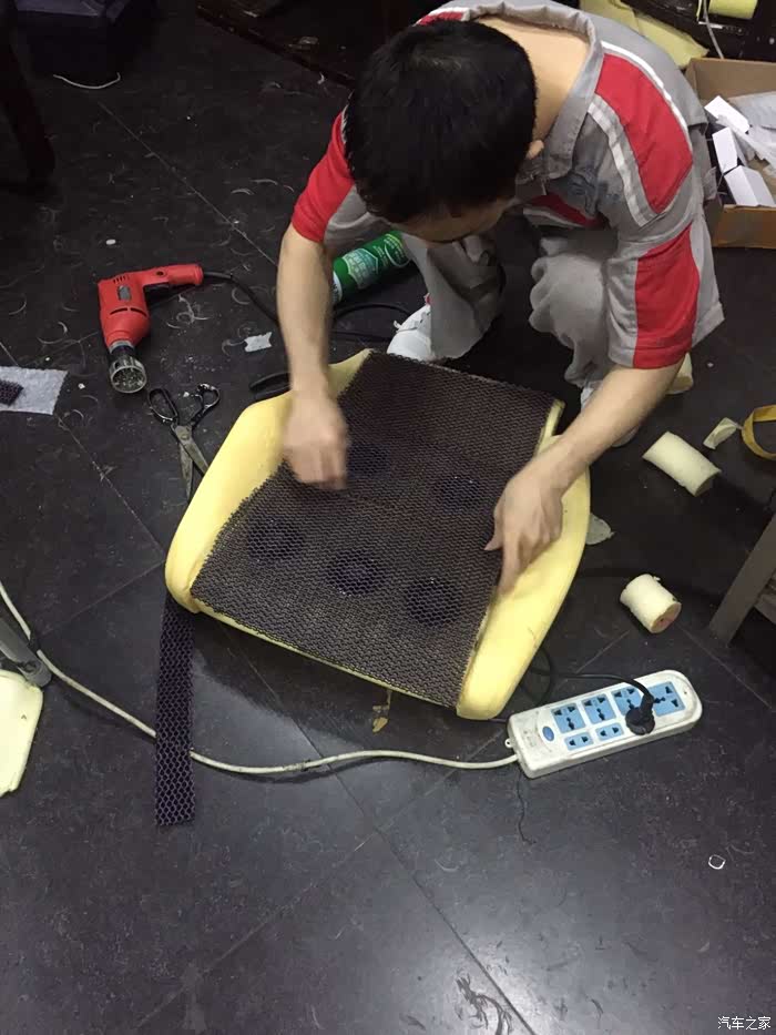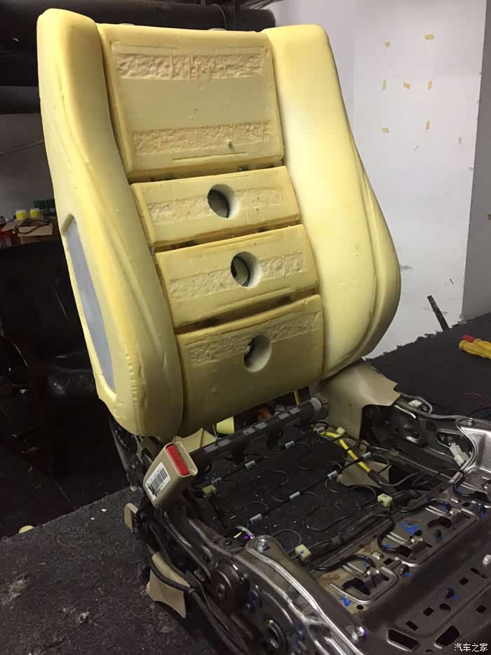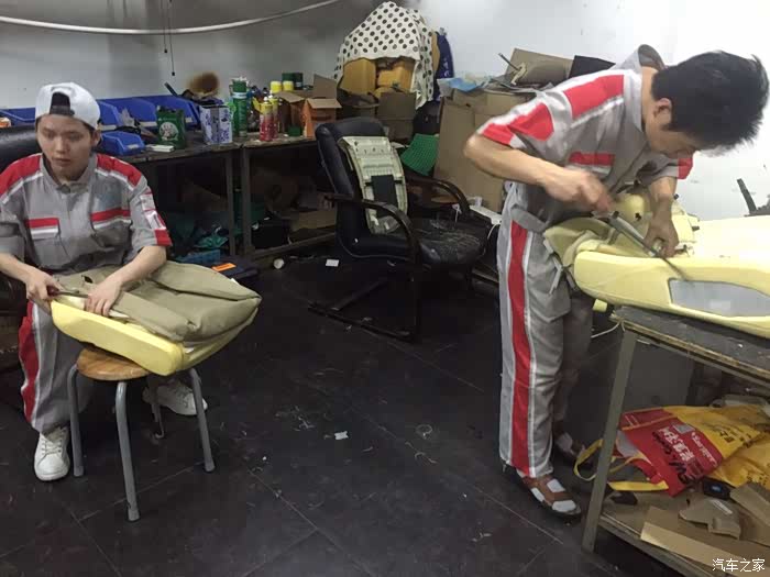 开搞了。。。 拆真皮,原来座椅里面是这样的,厚实的海绵。 师傅看起来轻车熟路的赶脚。