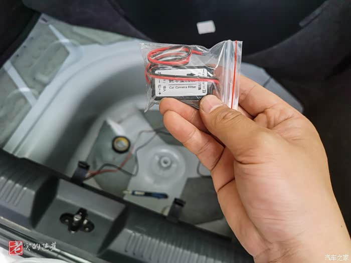 另外好需要加入一个镇流器什么的,按输入输出的顺序接好,输入一段接入到倒车灯电源线,输出端正负极接到摄像头一端。