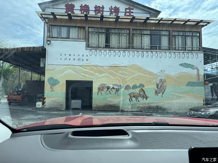 开进来之后是个蛮大的院子,中间有两层半的小楼两边搭的棚子很古朴的风格,墙上画的很多羊还蛮应景的哈哈。
