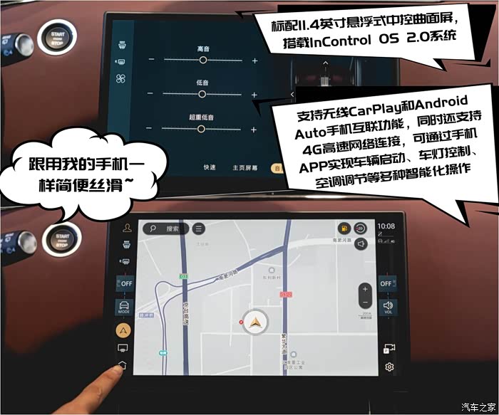 表姐一坐进车里就发现这车很简约,因为中控区基本没啥物理按键,像是空调控制,驾驶模式选择等这些都塞到那块中控屏去了,她还玩了半天,说跟玩自己手机差不多,很流畅。