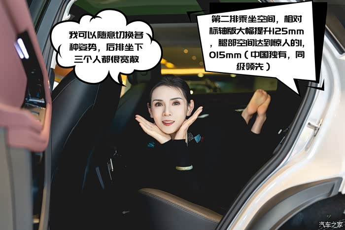 加长版的揽胜极光L,空间自然不会拉胯,后排腿部空间足足有1015mm,表姐身高175cm坐进去头部和腿部的空间都很有盈余。
