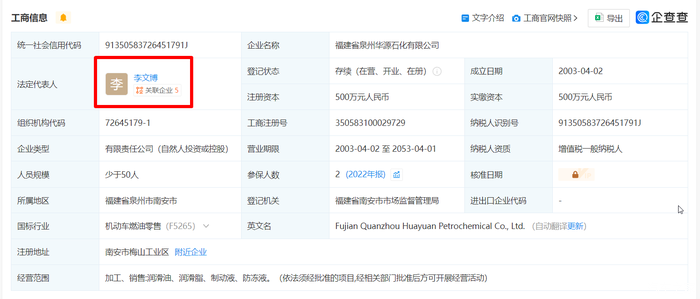 公司状态处于“休眠”状态,我对外国工商规定不了解,有懂的盘腰大佬可以赐教下。企业注册人员2人,其中1位老板名字是“WenBo Li”国籍“China”。然后我又查了这个“英国品牌”授权唯一国内生产厂“泉州华源石化”企业信息: