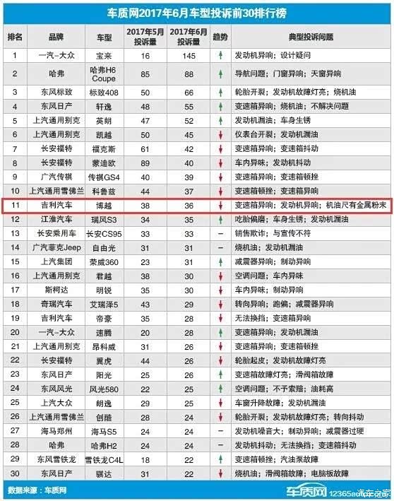 请大家认真的看一下,上边那张表,是17年5和6月的投诉表,5月博越投诉38起,6月投诉36起。关键是少了两起,我感觉这点证明了很多问题。不是车子变好了,而是我们对车熟悉了。感觉找到了。经常开车的人都能明白一个道理,就是开习惯一种车型,突然之间换另一种车型,开着都会很不习惯。离合,油门,档位,都不一样了,油离配合的不够顺畅,导致顿挫,异响,这都是正常的,因为我们没有找到那个点,这个点指的就是到多少转数,离合松的快慢,油门踩得大小,三者衔接顺不顺畅的那个点。只要这三者能衔接好,我相信上边博越的投诉量还会减少,我的亲身感受就是,车没问题,是开车人不熟悉车的问题,时间长了慢慢熟悉了就没有所谓的异响了。