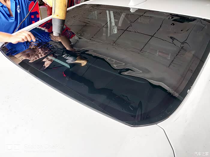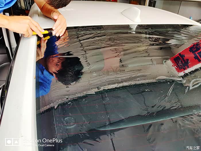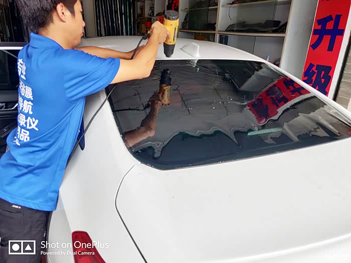 师傅已经开始在后档玻璃加热,应该是让里面的水挥发完全,让贴膜贴的更稳吧。
