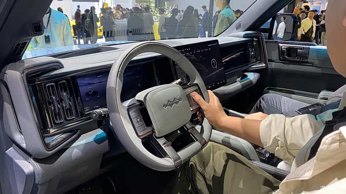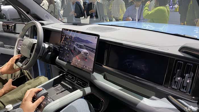 来到内饰,给我一种眼前一亮的感觉,显得很硬派,年轻,中控台部分共搭载了三块屏幕,中央是一块15.6英寸2.5K高清中控多媒体屏,主驾采用12.3英寸仪表屏,副驾位置搭载12.3英寸多媒体娱乐屏。