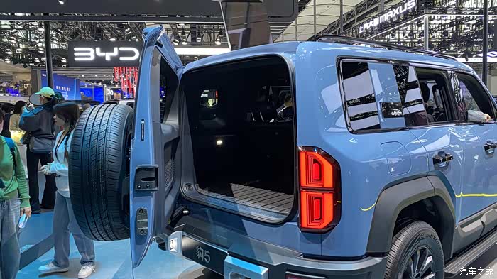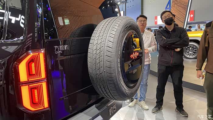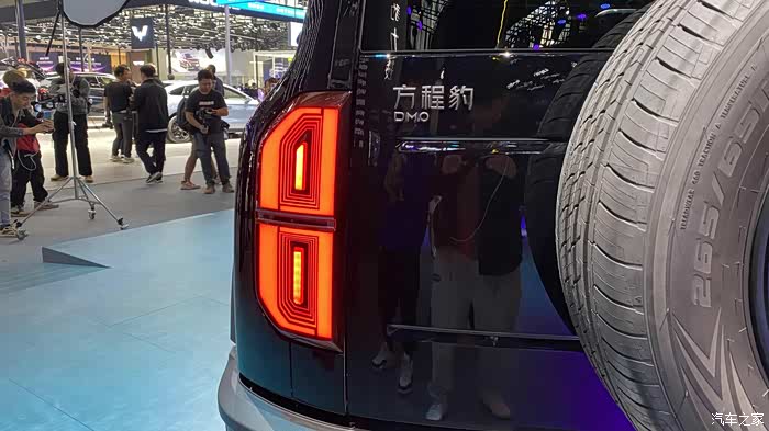 车尾的设计比较方正斯文,尾灯造型还不错,点亮效果质感也很ok,轮胎直接裸露背挂在尾门上,值得一提的就是,值得一提的是,尾门采用从右向左的开启方式设计,并且还配备电吸门功能。